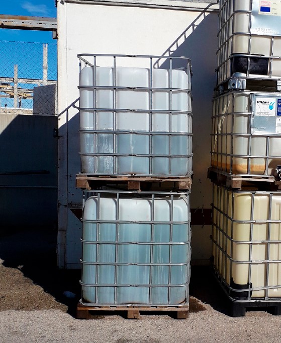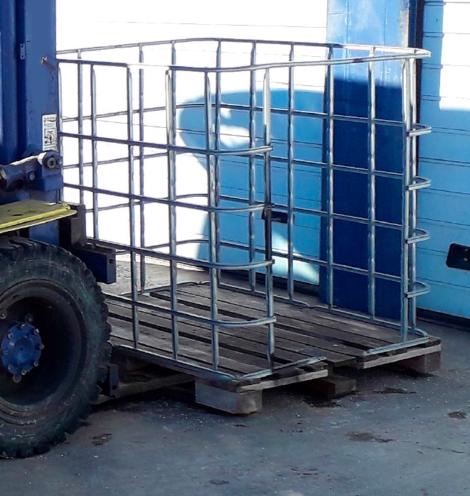 - La cesta de fabricación casera se había configurado aprovechando la estructura para la manipulación mecánica de depósitos de plástico de amplia capacidad (igual o superior a 1.000 l). Se había retirado el depósito, de manera que el espacio disponible permitía el acceso del trabajador a modo de cesta. Las dimensiones del palé de madera que hacía de base eran 1.200 x 1.000 mm. La altura de la estructura metálica, que hacía las veces de barandilla, era de 1.200 mm. Uno de los lados de la cesta se encontraba completamente abierto, dada la configuración de la estructura inicial de soporte de depósitos.
