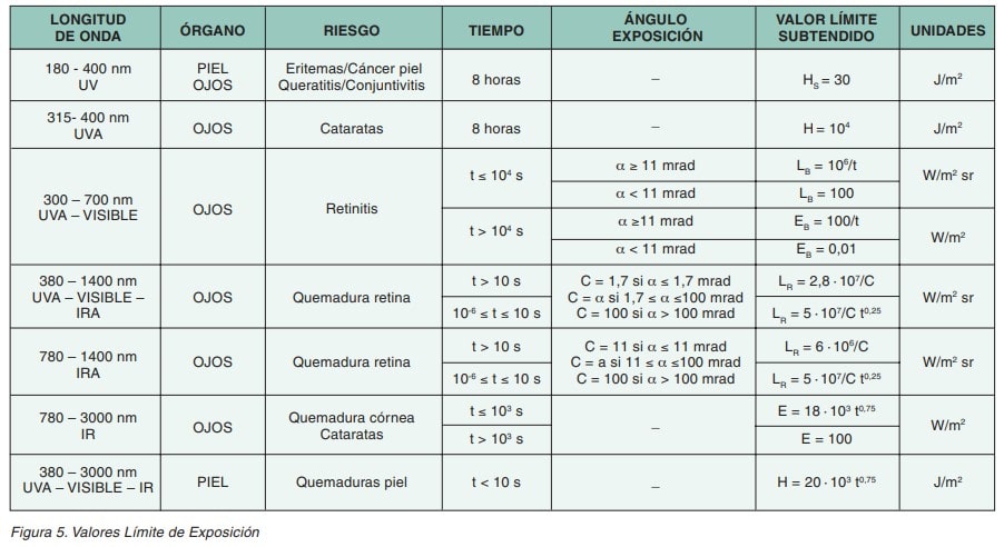 En la figura 5 se exponen los valores límite de forma resumida. Por ejemplo, si se está evaluando el riesgo de exposición de los ojos a la radiación UVA, la magnitud a evaluar será la Exposición Radiante (H), y el valor límite será 104 J/m2 para un tiempo de exposición de 8 horas.