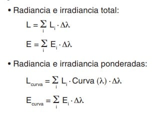 Los espectrorradiómetros son equipos bastante más complejos que, además de la información que proporcionan los radiómetros, generan un espectro de la fuente, con el que se puede calcular manualmente, tanto las magnitudes totales como las ponderadas a partir de las siguientes fórmulas: