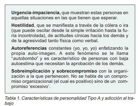 Por otra parte, los estudios existentes del problema ponen de manifiesto, desde la vertiente de la estructura de personalidad, que se dan determinados perfiles. Es el caso de la Personalidad Tipo A, entendida como un patrón complejo de acción-emoción en personas enfrascadas en una lucha interminable por conseguir objetivos mal definidos en el menor tiempo posible y a cualquier coste. El Inventario de Actividades de Jenkins (JAS; Jenkins, Zyzanski, y Rosenman, 1979) permite valorar esta personalidad en una serie de dimensiones subrogadas: prisa e impaciencia (factor S), implicación en el trabajo (factor J) y la dimensión de comportamiento duro y competitivo (factor H). En la tabla 1 aparecen las características principales de la Personalidad Tipo A que se relacionan con la adicción al trabajo. No obstante hay que decir que no por describirse una Personalidad Tipo A se desarrolla una adicción al trabajo. Es una variable personal que, coadyuvando con ciertas condiciones de trabajo, expuestas más adelante, puede dar como resultado la aparición de una adicción al trabajo.