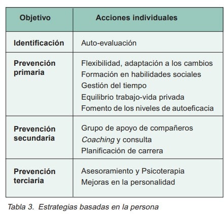 Las acciones a nivel individual resultan las más habituales en la mayoría de los casos. Estas acciones se centran en mejorar los recursos personales de las personas afectadas por la adicción al trabajo (ver tabla 3).