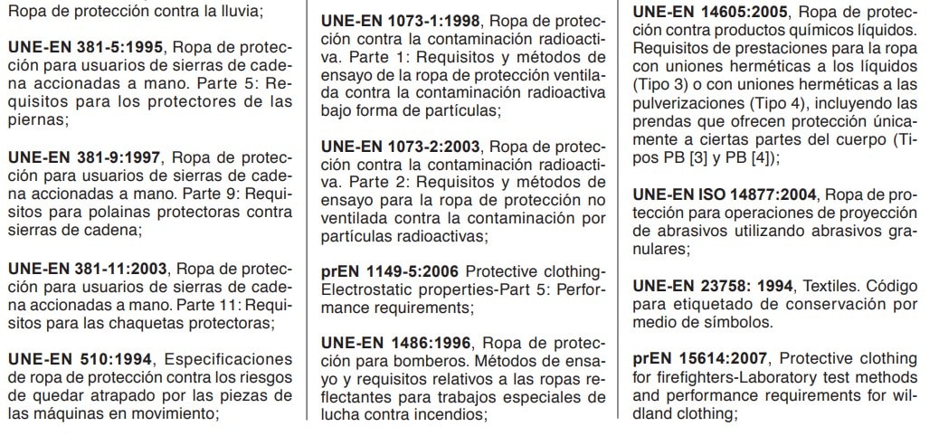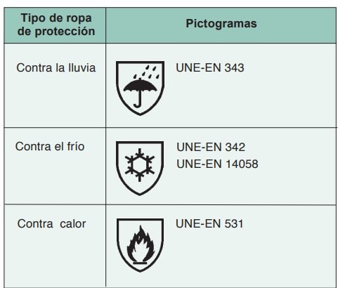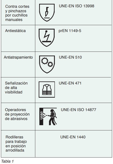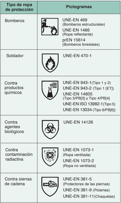 En la tabla 1 se enumeran normas específicas de ropa de protección con la norma técnica de referencia y, en su caso, los pictogramas asociados.