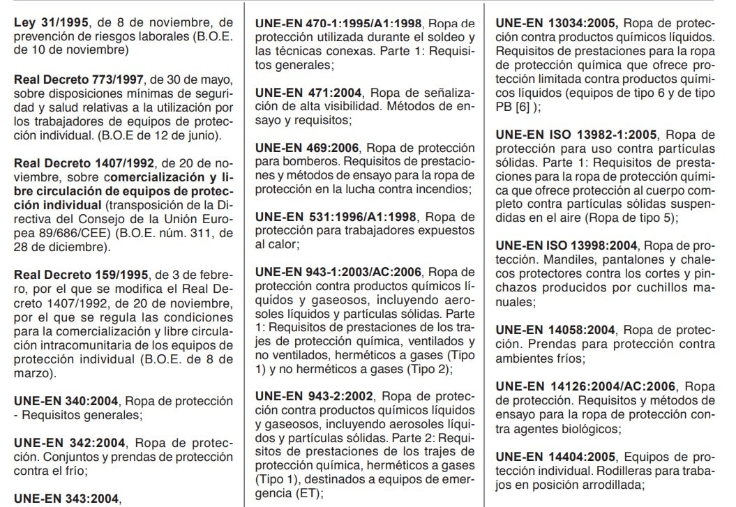 Toda la ropa de protección cumplirá, por tanto, con lo que en esta nota se establece, además de con lo que se indique en su norma específica.