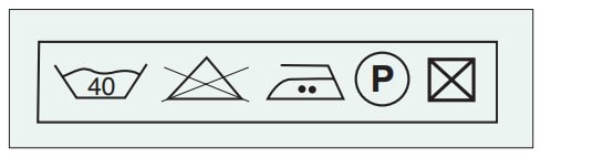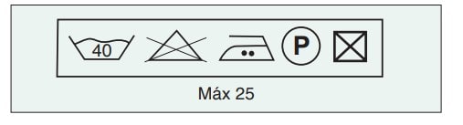- Instrucciones completas para la limpieza y/o descontaminación: por ejemplo, temperatura de limpieza, procedimiento de secado, pH, acción mecánica, número máximo de ciclos de limpieza. En aquellos casos en que la prenda pueda ser sometida a ciclos de limpieza sin que se alteren sus propiedades protectoras, deben indicarse las instrucciones a seguir. Para ello se usarán los símbolos de limpieza normalizados establecidos en la norma UNE EN 23758 cuya aplicación está generalizada a todo tipo de prendas de vestir. Los símbolos deben explicarse.