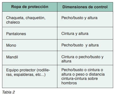 Las dimensiones de control dependen del tipo de prenda y, en cualquier caso, el fabricante puede dar información de otras dimensiones adicionales si lo estima conveniente. En la tabla 2 se indican las dimensiones de control para los distintos tipos de prendas.
