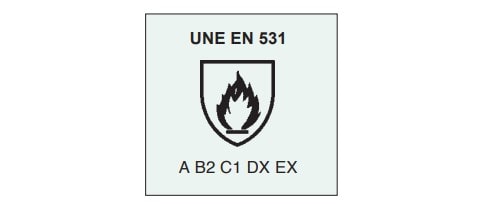 - B: Calor convectivo. Asociado al tiempo medio necesario para que se produzca un aumento de temperatura de 24 ºC al exponer el material a una fuente de calor convectivo. Hay 5 niveles posibles y el B2 corresponde a un índice de transferencia del calor de entre 7 y 12 segundos.