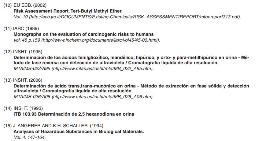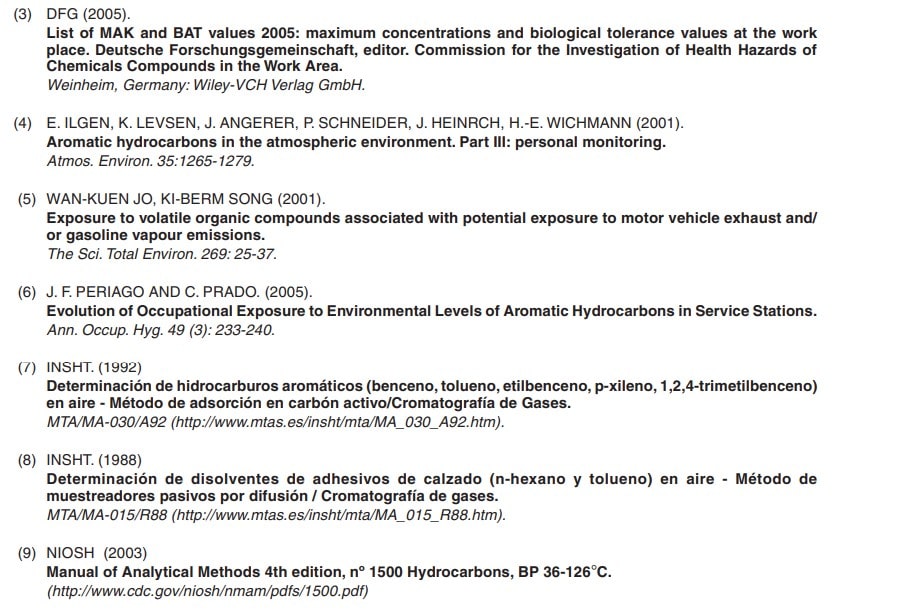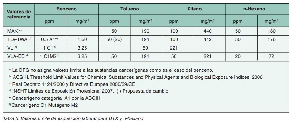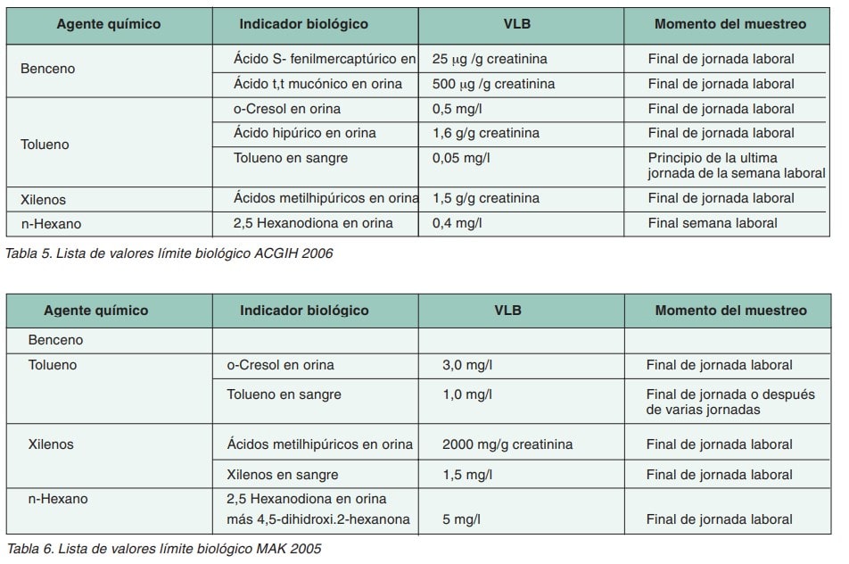 Dado que para BTX y el n-hexano la vía dérmica puede ser significativa, para un control total de la exposición laboral está indicado el control biológico. Los límites biológicos (VLB) para el benceno, tolueno, xilenos y n-hexano están detallados en las tablas 4, 5 y 6.