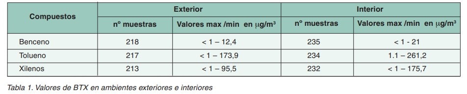 Los resultados obtenidos en estudios realizados por el INSHT para determinar el nivel de contaminación de fondo de estos contaminantes en aire interior y exterior y así poder establecer un nivel a partir del cual la contaminación se pueda atribuir a la exposición laboral están descritos en la tabla 1.