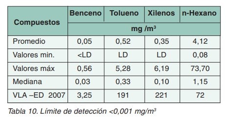 Se llevó a cabo mediante la determinación de BTX y nhexano, tomando las muestras con monitores pasivos ORSA o RADIELLO, colocados en la zona respiratoria del trabajador durante el turno de trabajo. Los resultados se muestran en la tabla 10.