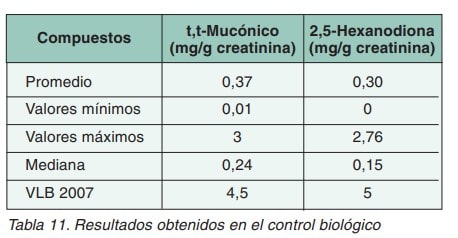 Se llevó a cabo mediante la determinación de t,t-mucónico en orina como indicador de la exposición a benceno y 2,5 hexanodiona en orina como indicador biológico de la exposición a n-hexano. Los resultados se muestran en la tabla 11. No se ha podido establecer una correlación directa entre las concentraciones ambientales y las concentraciones en orina debido a que las primeras eran del orden de 100 veces por debajo del VLA-ED. Ver la Tabla 11. Las concentraciones más elevadas de acido t,t-mucónico se han detectado en personas fumadoras observándose una diferencia significativa respecto a las no fumadoras. Ver la nota técnica 486 sobre Evaluación de la exposición laboral a benceno: control ambiental y biológico.