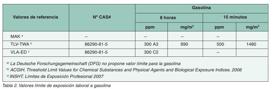Los valores límite ambientales propuestos para la gasolina por diferentes países y organismos se describen en la tabla 2.