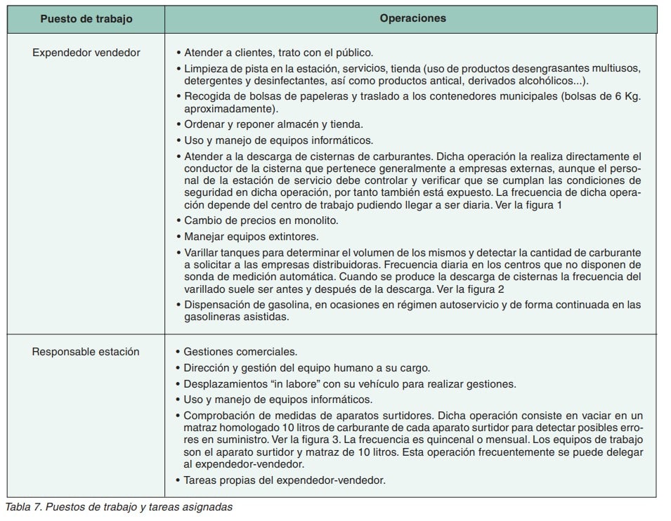 En las estaciones de servicio existen principalmente dos puestos de trabajo: el expendedor-vendedor o expendedor y el responsable de la estación de servicio. En la Tabla 7 se describen las tareas asignadas a cada puesto de trabajo.