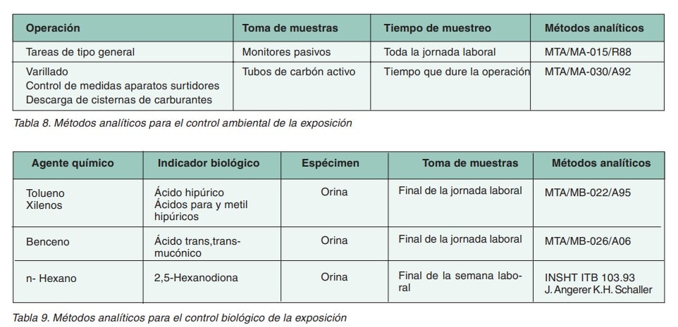 La utilización de monitores pasivos es el sistema ideal cuando los tiempos de exposición son largos y las operaciones realizadas dentro de la jornada laboral variadas ya que el resultado es el valor medio de la concentración a que han estado expuestos los trabajadores durante todo el tiempo que se ha llevado a cabo la toma de muestras. En cambio, los monitores pasivos no son suficientemente sensibles para medir exposiciones puntuales a concentraciones elevadas, como es el caso de operaciones como la descarga de cisternas, varillado y la comprobación de las medidas de los aparatos surtidores. En estos casos las muestras deben tomarse mediante captación activa (tubo adsorbente más bomba personal calibrada). En la tabla 8 se indican los métodos analíticos propuestos en función del tipo de toma de muestras.