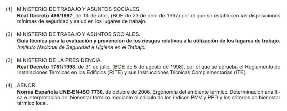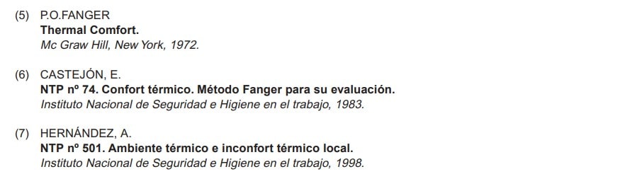 Para el ambiente térmico, los valores de temperatura operativa están basados en los niveles de actividad típicos para la tarea que se desarrolla en dichos espacios y que normalmente se corresponde con una actividad sedentaria teniendo en cuenta una indumentaria de 0,5 clo durante el verano (período de funcionamiento de la refrigeración) temperatura y de 1 clo durante el invierno (período de funcionamiento de la calefacción).
