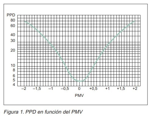 El índice PPD permite predecir de forma cuantitativa el porcentaje de insatisfechos. En la figura 1 se muestra la gráfica que relaciona los índices PMV y PPD.