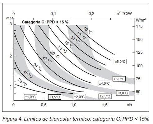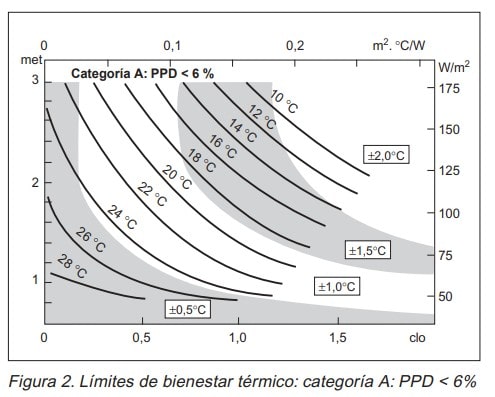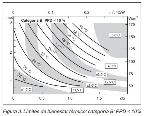 Para un espacio dado en el que se desarrolla una cierta actividad física y se viste una ropa determinada existe una temperatura operativa óptima que corresponde a la sensación térmica neutra, es decir, a un índice PMV igual a cero. Los límites de bienestar térmico alrededor de la temperatura operativa se establecen a partir del PMV fijado en el diseño. En las figuras 2, 3 y 4 se muestran dichos límites para cada una de las categorías de calidad de ambiente térmico.