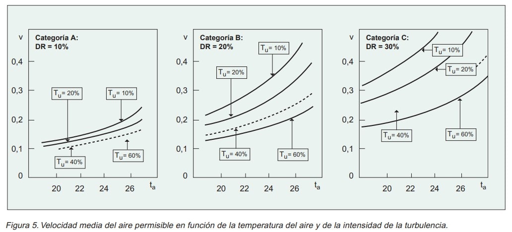 En la tabla 3 se establecen los porcentajes de insatisfechos para las tres categorías de calidad de ambiente térmico ligadas a la incomodidad térmica local y entre ellas la debida a la presencia de corrientes de aire. La figura 5 muestra las gráficas de las que se puede deducir la máxima velocidad media del aire en función de la temperatura y de la intensidad de la turbulencia para cada una de las categorías establecidas.