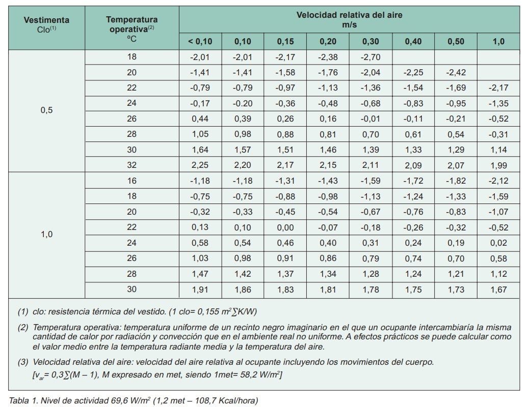 En la tabla 1 se muestran, a título de ejemplo, los valores de PMV correspondientes a una actividad sedentaria, para la indumentaria típica de verano y de invierno y para diferentes valores de temperatura operativa y velocidad relativa del aire.