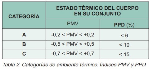 El establecimiento de categorías de calidad de ambiente térmico pretende dar respuesta a las distintas necesidades que pueden tener los países en cuanto a desarrollo técnico, prioridades nacionales o, incluso, a diferencias climáticas, de forma que los índices PMV, PPD y PD permitan establecer diferentes rangos de parámetros ambientales que faciliten el diseño de las instalaciones, así como la evaluación del bienestar térmico. En la tabla 2 se muestran las tres categorías de calidad de ambiente térmico correspondientes a los índices PMV y PPD relativos a la sensación térmica del conjunto del cuerpo y el grado de insatisfacción que la situación térmica provocaría en los ocupantes.
