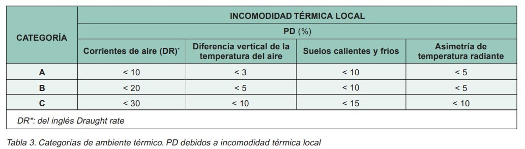 En la tabla 3 se recogen las categorías de ambiente térmico que corresponden a los porcentajes de insatisfechos debidos a los diferentes factores de malestar térmico localizado considerados.