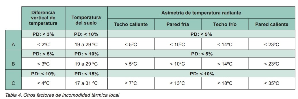 En este apartado se incluyen los valores de los parámetros físicos que definen los demás factores considerados como susceptibles de causar incomodidad térmica local. Dichos parámetros corresponden a: la temperatura del aire que permite verificar la cuantía de la diferencia vertical de temperaturas, la temperatura del suelo que permite determinar la incomodidad por suelos demasiado fríos o calientes y la temperatura de planos radiantes que permite calcular la asimetría de temperatura radiante. En la tabla 4 se resumen los valores permitidos de estos parámetros para cada una de las categorías de calidad establecidas.