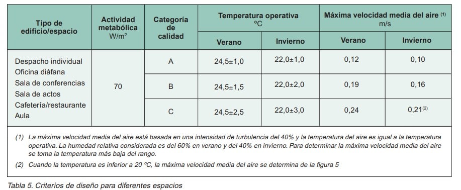 En la tabla 5 se indican los criterios de diseño para algunos espacios y para los que se han asumido ciertas hipótesis.