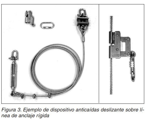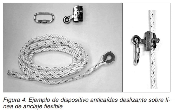 Es un subsistema de conexión formado por un dispositivo anticaídas deslizante, una línea de anclaje rígida o flexible y un conector o un elemento de amarre terminado en un conector (figuras 3 y 4).