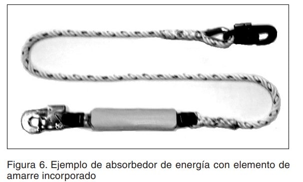 Es un equipo constituido por un elemento de amarre que lleva incorporado un elemento de absorción de energía (en el caso más general se trata de dos cintas textiles imbricadas o cosidas constituyendo una única pieza que se presenta plegada sobre sí misma y enfundada en un material plástico). La disipación de energía se consigue mediante la rotura de los hilos. La longitud total del referido conjunto no es superior a dos metros, incluyendo los conectores situados en cada extremo (figura 6).