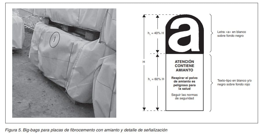 - Los embalajes se señalizarán con etiquetas que indiquen que contienen amianto de acuerdo con el Anexo II del RD 1406/1989. Ver la figura 5.