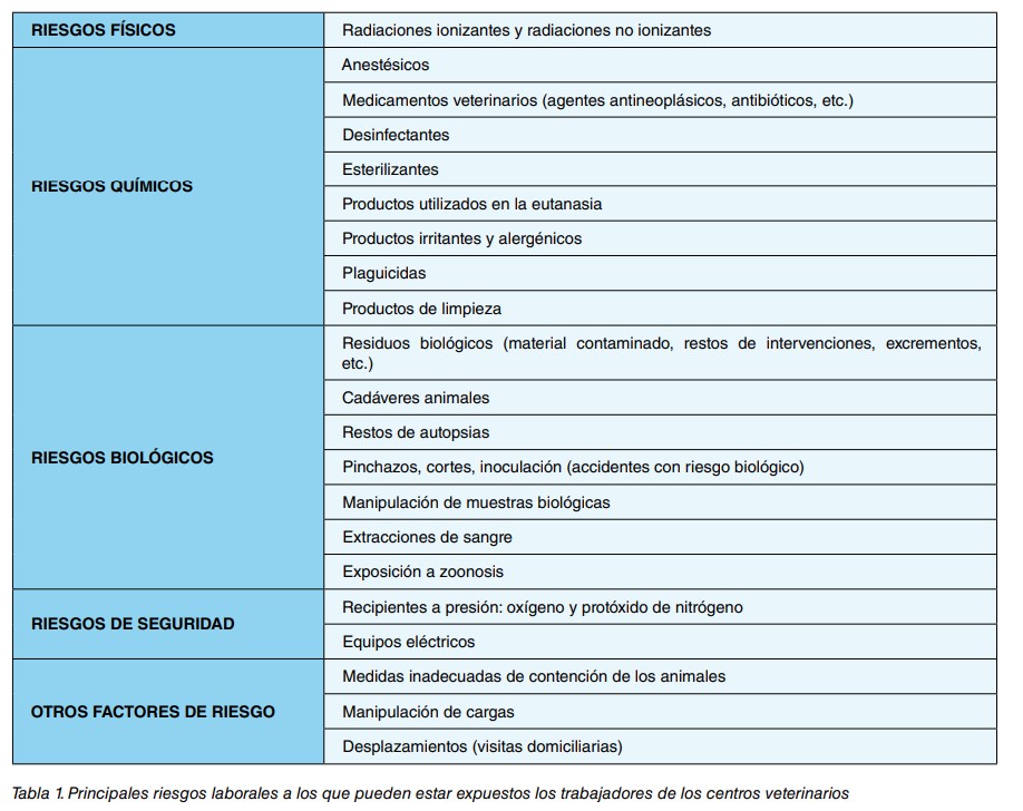 Los trabajadores de los centros veterinarios son un colectivo expuesto a distintos riesgos laborales en su actividad diaria, asociados tanto a la exposición a agentes físicos y químicos como a agentes biológicos (véase tabla 1).