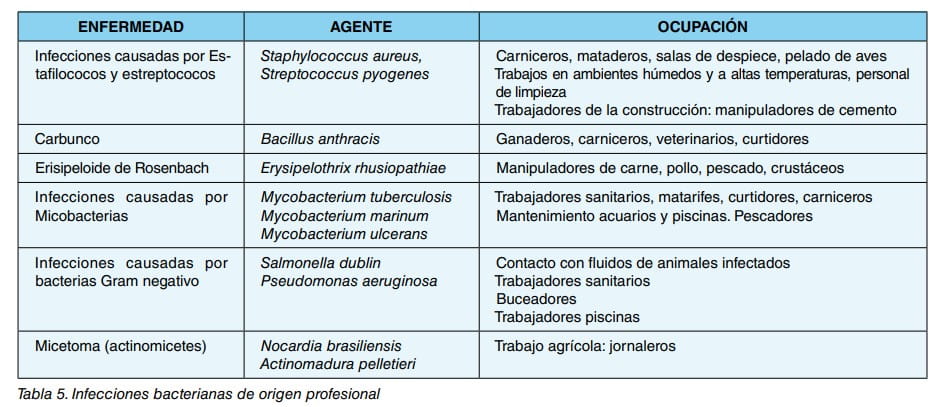 En la tabla 5 se muestran las principales infecciones dérmicas causadas por bacterias y los principales sectores de actividad y/o profesiones afectadas.