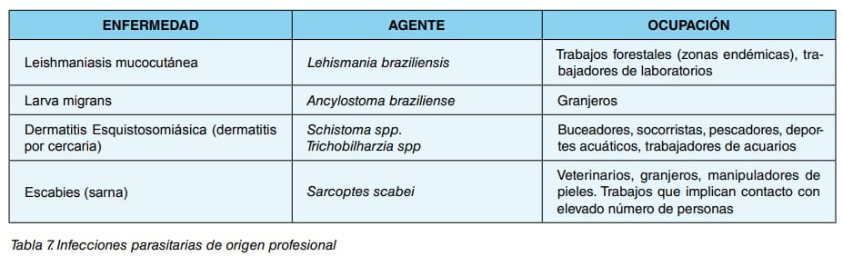 En la tabla 7 se muestran las principales infecciones dérmicas causadas por parásitos y los principales sectores de actividad y/o profesiones afectadas.