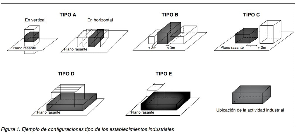 Los establecimientos industriales quedan clasificados en 5 configuraciones dependiendo de si están ubicados en un edificio o en espacios abiertos que no constituyen un edificio. (Figura 1).