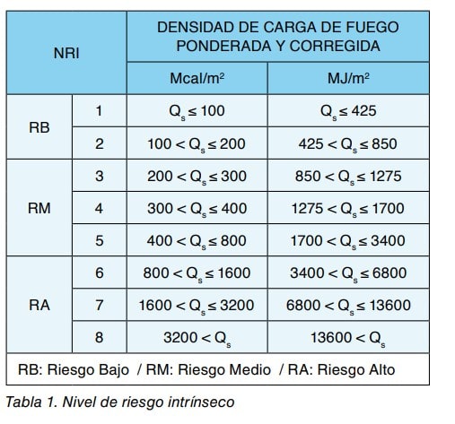 Calculada la densidad de carga de fuego, ponderada y corregida, de un sector de incendio (Qs), un edificio industrial (Qe) o un establecimiento industrial (QE), según cualquiera de los procedimientos anteriores, los niveles de riesgo intrínseco de incendio quedan establecidos tal como se indica en la tabla 1.