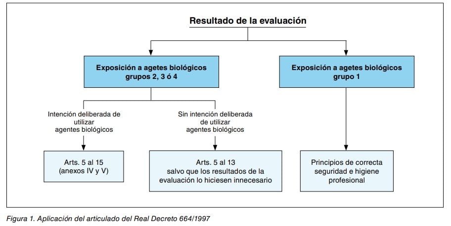 El Real Decreto 664/1997 establece en su artículo 4 que identificados uno o más riesgos relacionados con la exposición a agentes biológicos durante el trabajo, se procederá, para aquellos que no hayan podido evitarse, a evaluar la naturaleza, el grado y duración de la exposición de los trabajadores, indicando, asimismo, que la evaluación se efectuará teniendo en cuenta toda la información disponible, en particular: su naturaleza y peligrosidad, las recomendaciones de las autoridades sanitarias, la información sobre las enfermedades que pueden ser contraídas, los efectos alérgicos y/o tóxicos potenciales o el riesgo adicional para los trabajadores especialmente sensibles. La norma continúa trazando las vías de aplicación del resto de los artículos en los que se establecen las acciones preventivas para el control de riesgos, desestimando, en principio, la medición de los agentes biológicos como elemento esencial de la evaluación.