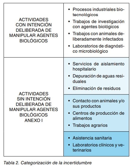 Ante la dificultad de cuantificar de una forma precisa esa incertidumbre, en la evaluación del riesgo se dará por supuesta la presencia del agente biológico. No obstante, puede resultar de interés concretar algo más este aspecto. En la tabla 2 se pueden ver diferentes actividades laborales clasificadas en distintos rangos de incertidumbre.