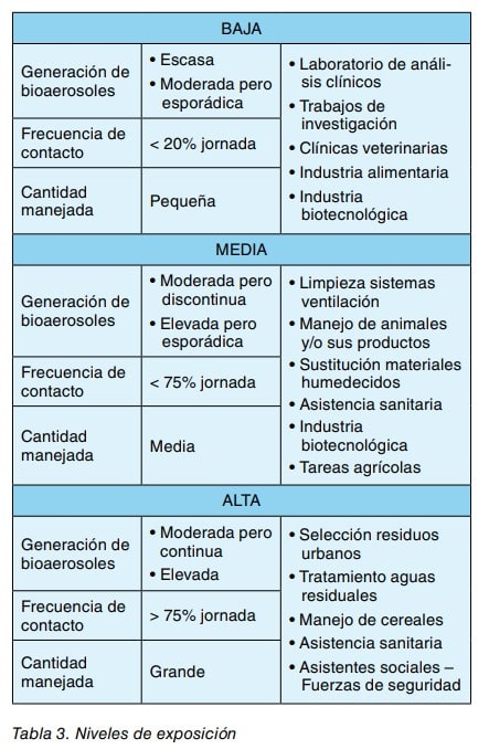 - ALTA, cuando la generación de bioaerosoles es ele vada o moderada pero continua, cuando la frecuencia de contacto supera el 75% de la jornada o se manejan grandes cantidades de materiales. En la tabla 3 se muestran algunos ejemplos de actividades agrupadas en función de la posibilidad de exposición.