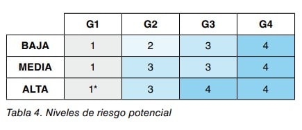 Como se indica anteriormente, cada cruce entre el nivel de exposición probable y las consecuencias determina un nivel de riesgo potencial. En la tabla 4 se muestran los niveles de riesgo potencial obtenidos de los diferentes cruces posibles.