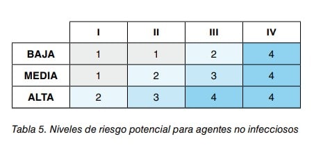- BAJA, cuando la generación de bioaerosoles es escasa o moderada pero esporádica, cuando la frecuencia de contacto es menor que el 20% de la jornada la boral o cuando se manejan pequeñas cantidades de materiales.