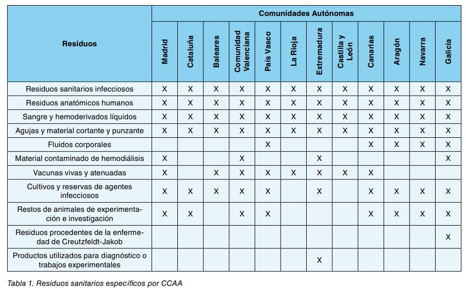 Según se desprende de lo observado en la tabla 1, algunos de estos residuos sólo están contemplados en algunas CCAA, como son: