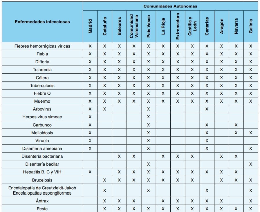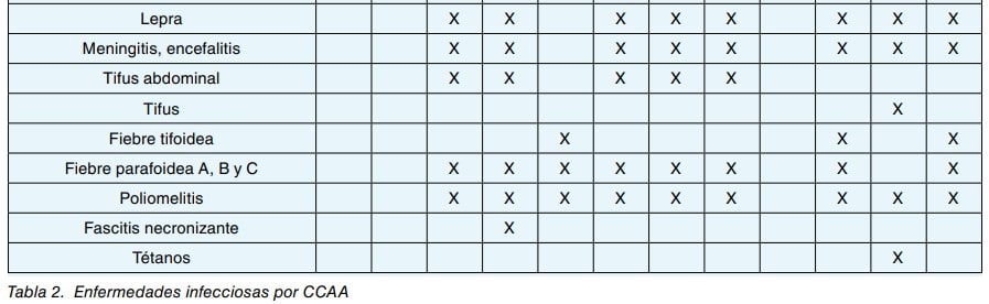 - Residuos sanitarios infecciosos: son aquellos que han estado en contacto con pacientes afectados por alguna de las enfermedades infecciosas que figuran en la tabla 2 y que por lo tanto pueden ser capaces de transmitirlas. Puede observarse que hay un grupo de enfermedades que es común a las diferentes CCAA, mientras que el resto varía de unas comunidades a otras. Ello puede ser debido a los distintos años de desarrollo normativo y a las características específicas de cada Comunidad Autónoma.