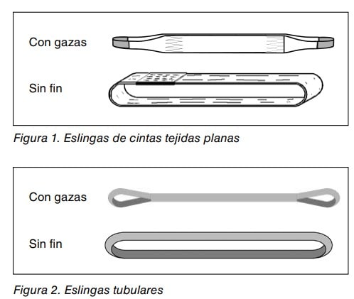 - Tipos de eslingas: las eslingas pueden ser de cintas tejidas planas (Ver fig. 1) o tubulares (Ver fig.2).