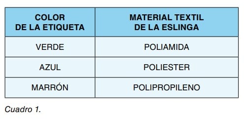El tipo de fibra de la eslinga se puede conocer por el color de la etiqueta identificativa. Ver cuadro 1.