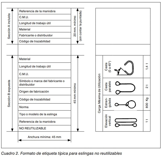 En los cuadros 2 y 3 pueden verse los formatos de etiquetas de eslinga para eslingas no reutilizables y reutilizables.