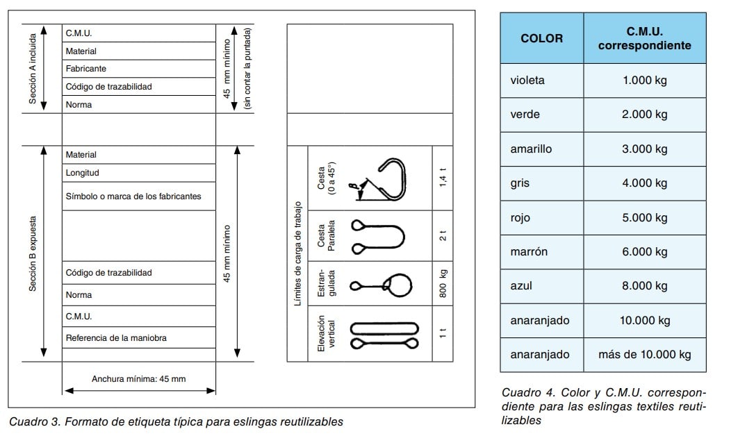 Para las eslingas reutilizables, además de estar especificada la C.M.U. en la etiqueta de la eslinga, también se identifica por el color de la cinta textil para las eslingas planas y por el color de la funda tubular para las eslingas tubulares. En el cuadro 4 se exponen los colores y la C.M.U. correspondiente.