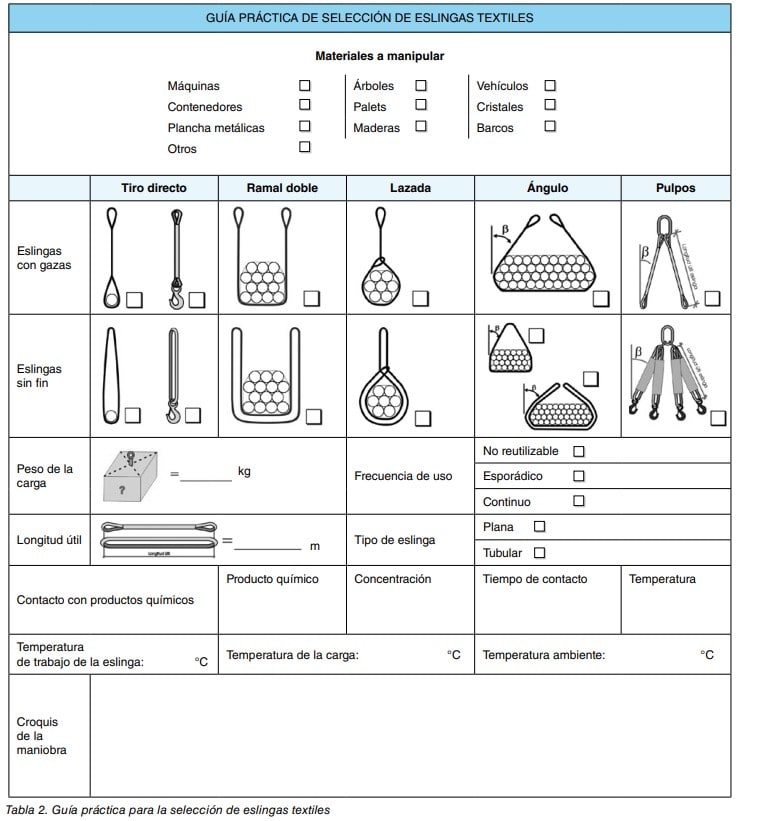 Con caracter previo a la selección de una determinada eslinga es conveniente tener en cuenta que la eslinga se usa única y exclusivamente para la elevación y manipu lación de la carga de un lugar a otro, y en cualquier caso no se debe utilizar como elemento de trincaje. Para seleccionar el tipo de eslinga se deberán tener en cuenta el peso total de la carga, la forma de sujetar ésta y el ambiente en el que va a trabajar la eslinga.