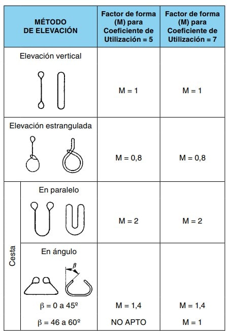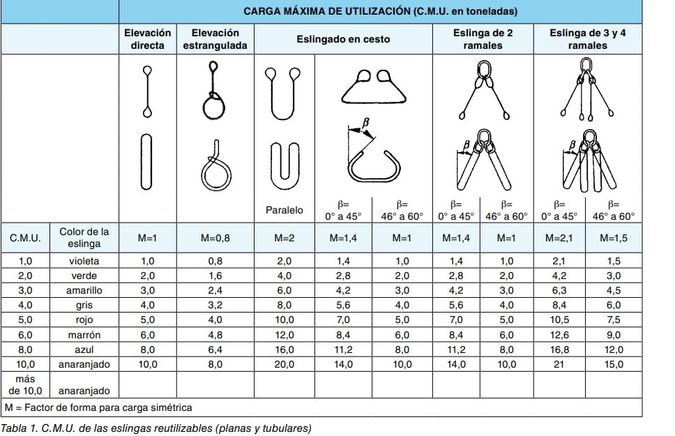 La carga máxima de utilización de una eslinga se determina multiplicando la C.M.U. de la eslinga en elevación directa por el factor de forma (M), según se muestra en la tabla 1.
