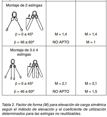 Así pues, para las eslingas no reutilizables, la C.M.U. para los diferentes tipos de eslingado será el resultado de multiplicar la C.M.U. de la eslinga en uso de elevación vertical por el correspondiente factor de forma según se indica en la tabla 2.