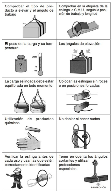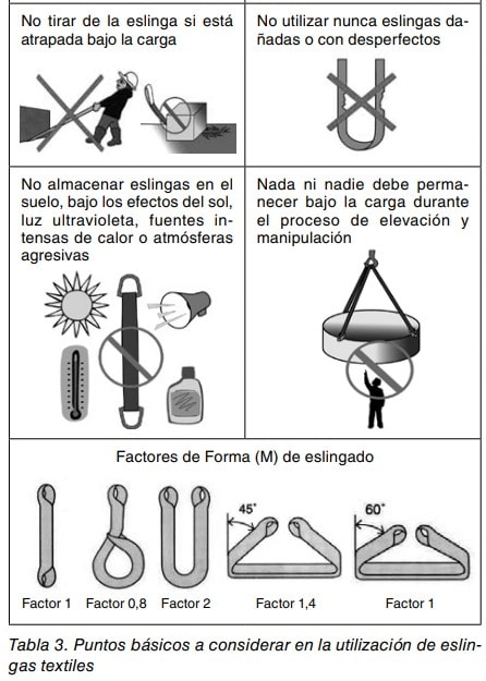 La información que debe tener un usuario de eslingas es esencial para asegurar su utilización correcta y segura. La tabla 3 ilustra los puntos básicos a considerar en la utilización de las eslingas textiles.