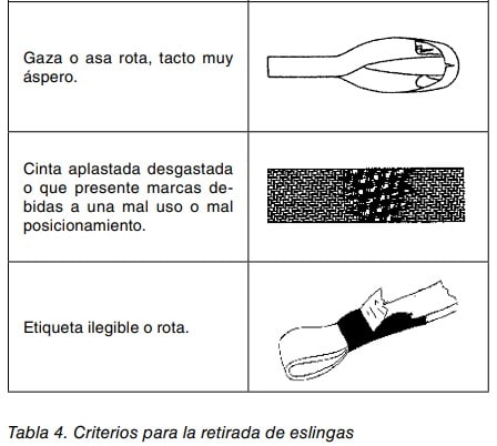 Antes de cada uso, la eslinga debe ser inspeccionada para detectar defectos y asegurarse de que la identificación es correcta. Los posibles defectos que pueden presentar una eslinga o sus accesorios son los siguientes (Ver tabla 4):